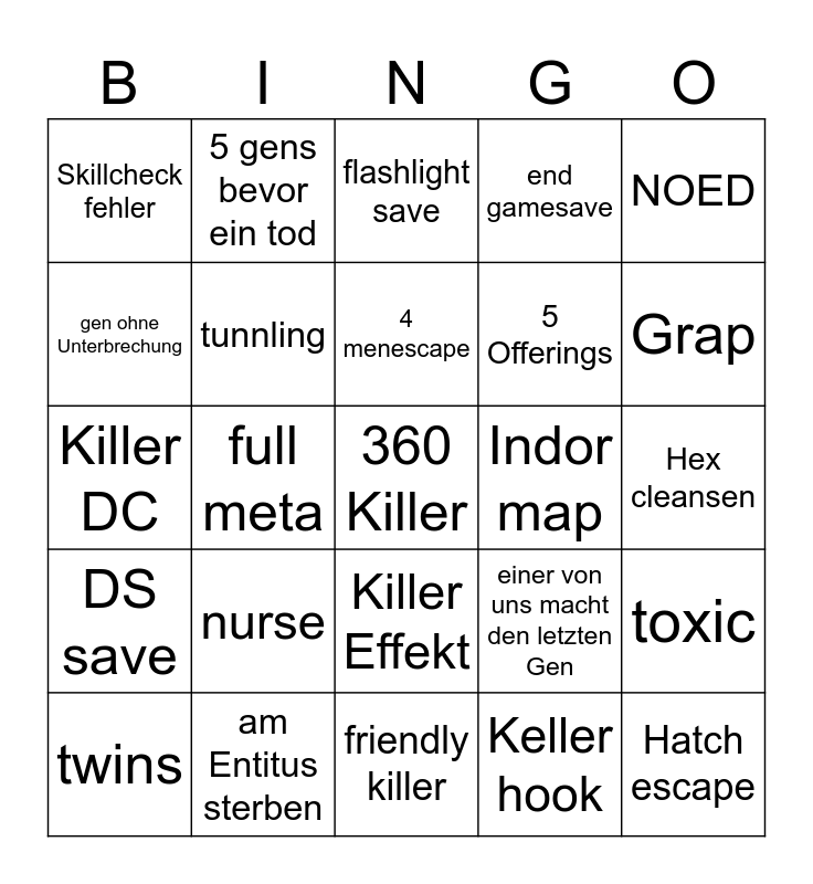 This bingo card has a free space and 24 words: nurse, am Entitus sterben, 4 menescape, twins, NOED, Skillcheck fehler, gen ohne Unterbrechung, 5 gens bevor ein tod, Indor map, Killer Effekt, 5 Offerings, Killer DC, einer von uns macht den letzten Gen, toxic, tunnling, Keller hook, Hex cleansen, flashlight save, Grap, full meta, Hatch escape, DS save, end gamesave and friendly killer.