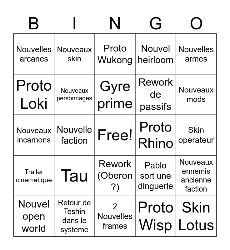 This bingo card has a free space and 24 words: Tau, Retour de Teshin dans le systeme, Gyre prime, Nouvel open world, Nouvelles armes, Nouvelles arcanes, Proto Loki, Nouveaux skin, Proto Rhino, Rework (Oberon ?), Rework de passifs, Nouveaux incarnons, Pablo sort une dinguerie, Nouveaux ennemis ancienne faction, Nouveaux personnages, Proto Wisp, Skin operateur, Proto Wukong, Nouveaux mods, Nouvelle faction, Skin Lotus, Trailer cinematique, Nouvel heirloom and 2 Nouvelles frames.