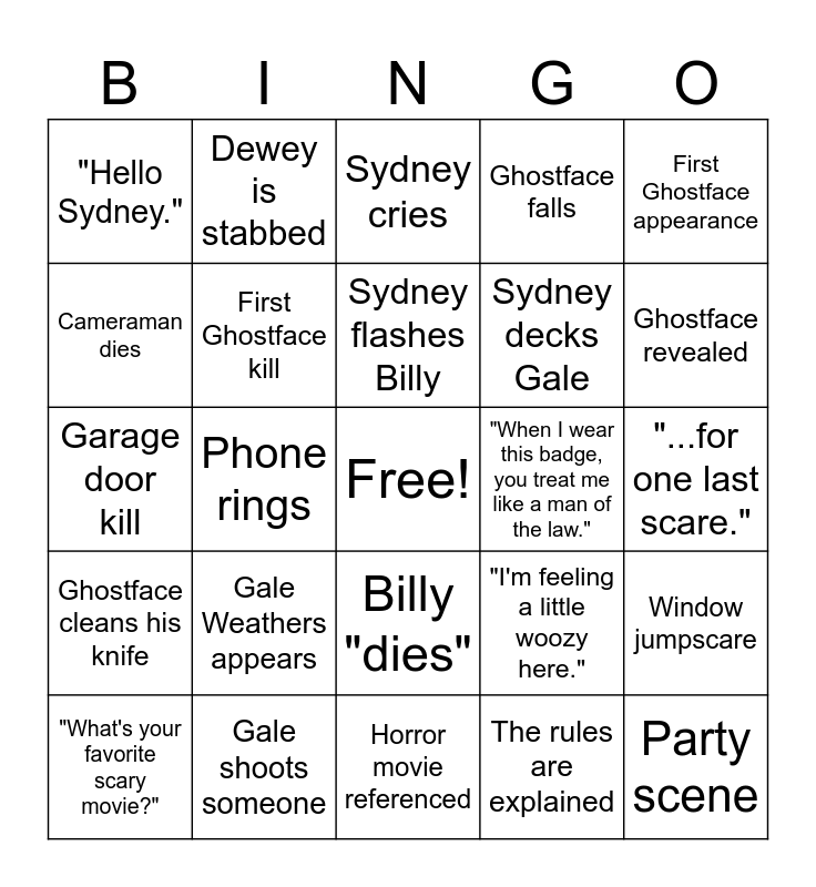 This bingo card has a free space and 24 words: Gale Weathers appears, Gale shoots someone, Sydney flashes Billy, "What's your favorite scary movie?", First Ghostface appearance, "Hello Sydney.", Cameraman dies, Dewey is stabbed, "When I wear this badge, you treat me like a man of the law.", Billy "dies", Sydney decks Gale, Garage door kill, "I'm feeling a little woozy here.", Window jumpscare, First Ghostface kill, The rules are explained, "...for one last scare.", Sydney cries, Ghostface revealed, Phone rings, Party scene, Ghostface cleans his knife, Ghostface falls and Horror movie referenced.