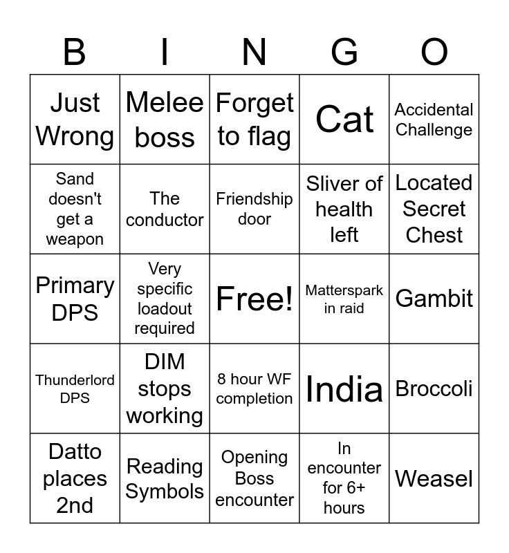 This bingo card has a free space and 24 words: DIM stops working, Reading Symbols, Friendship door, Datto places 2nd, Accidental Challenge, Just Wrong, Sand doesn't get a weapon, Melee boss, Matterspark in raid, 8 hour WF completion, Sliver of health left, Primary DPS, India, Broccoli, The conductor, In encounter for 6+ hours, Gambit, Forget to flag, Located Secret Chest, Very specific loadout required, Weasel, Thunderlord DPS, Cat and Opening Boss encounter.