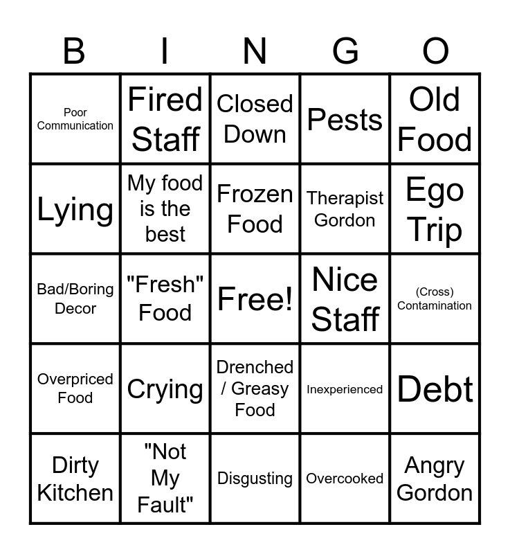 This bingo card has a free space and 34 words: Raw, Overcooked, Delusion, Gordon Approves, Overpriced Food, My food is the best, Old Food, Dirty Kitchen, Fired Staff, Microwave, Frozen Food, Closed Down, Abusive, Fights with Gordon, Nice Staff, Ego Trip, "Not My Fault", Bad/Boring Decor, Crying, Inexperienced, Drenched / Greasy Food, Neglected Storage, Poor Communication, (Cross) Contamination, Disgusting, Angry Gordon, Pests, Walks out on Gordon, Therapist Gordon, Lying, Doesn't care / Unmotivated / Lazy, "Fresh" Food, Debt and In Denial.