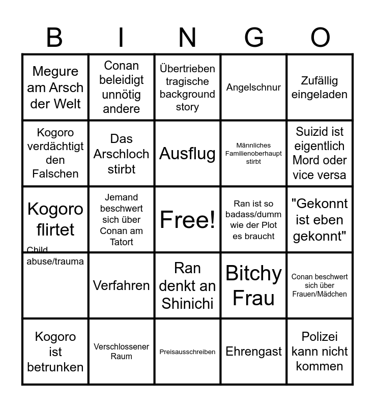 This bingo card has a free space and 24 words: Kogoro ist betrunken, Verfahren, Ausflug, Ehrengast, Zufällig eingeladen, Megure am Arsch der Welt, Conan beleidigt unnötig andere, Übertrieben tragische background story, Ran ist so badass/dumm wie der Plot es braucht, "Gekonnt ist eben gekonnt", Kogoro flirtet, Das Arschloch stirbt, Bitchy Frau, Conan beschwert sich über Frauen/Mädchen, Kogoro verdächtigt den Falschen, Verschlossener Raum, Preisausschreiben, Angelschnur, Suizid ist eigentlich Mord oder vice versa, Child abuse/trauma, Jemand beschwert sich über Conan am Tatort, Ran denkt an Shinichi, Männliches Familienoberhaupt stirbt and Polizei kann nicht kommen.