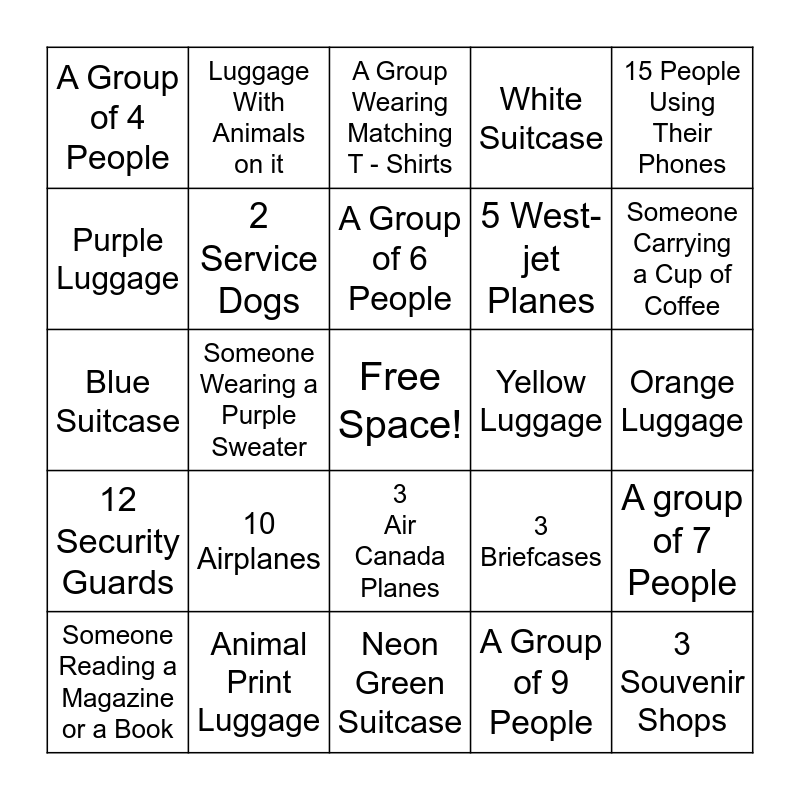 This bingo card has a free space and 24 words: 10 Airplanes, Animal Print Luggage, A Group of 6 People, Someone Reading a Magazine or a Book, 15 People Using Their Phones, A Group of 4 People, Purple Luggage, Luggage With Animals on it, Yellow Luggage, 3 Air Canada Planes, 5 West-jet Planes, Blue Suitcase, 3 Briefcases, A group of 7 People, 2 Service Dogs, A Group of 9 People, Orange Luggage, A Group Wearing Matching T - Shirts, Someone Carrying a Cup of Coffee, Someone Wearing a Purple Sweater, 3 Souvenir Shops, 12 Security Guards, White Suitcase and Neon Green Suitcase.