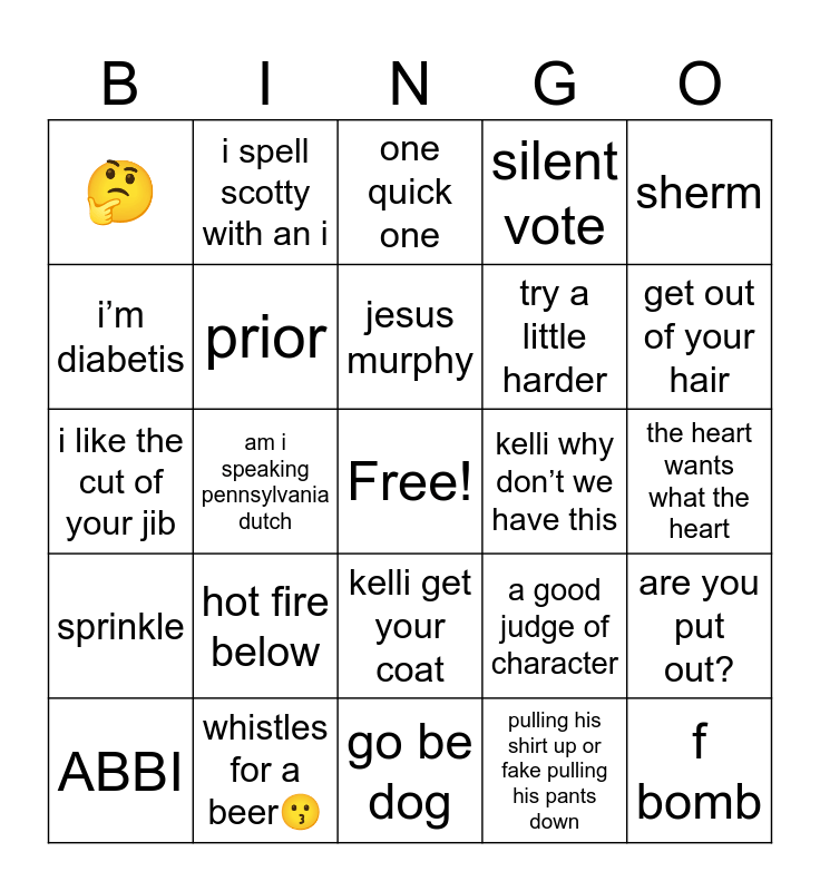 This bingo card has a free space and 24 words: hot fire below, whistles for a beer😗, jesus murphy, ABBI, sherm, 🤔, i’m diabetis, i spell scotty with an i, kelli why don’t we have this, kelli get your coat, try a little harder, i like the cut of your jib, a good judge of character, are you put out?, prior, pulling his shirt up or fake pulling his pants down, the heart wants what the heart, one quick one, get out of your hair, am i speaking pennsylvania dutch, f bomb, sprinkle, silent vote and go be dog.
