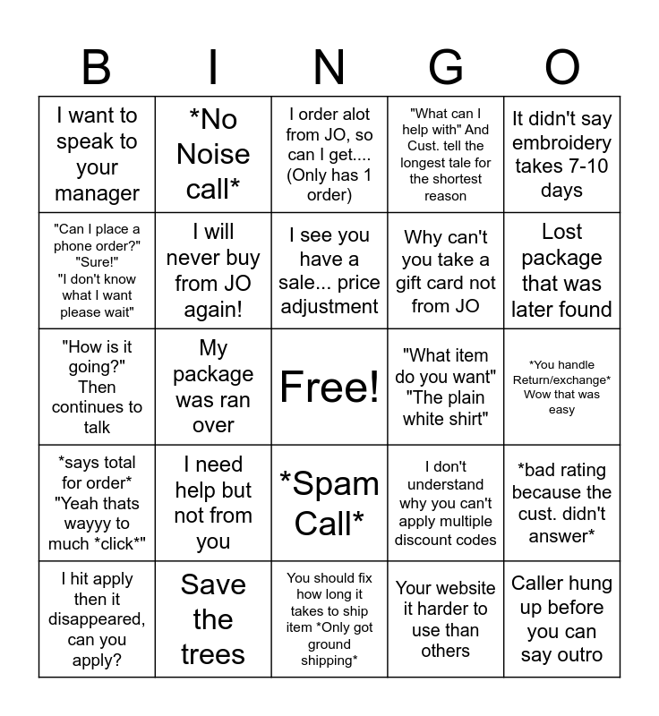This bingo card has a free space and 24 words: I need help but not from you, Save the trees, I see you have a sale... price adjustment, I hit apply then it disappeared, can you apply?, It didn't say embroidery takes 7-10 days, I want to speak to your manager, "Can I place a phone order?" "Sure!" "I don't know what I want please wait", *No Noise call*, "What item do you want" "The plain white shirt", *Spam Call*, Why can't you take a gift card not from JO, "How is it going?" Then continues to talk, I don't understand why you can't apply multiple discount codes, *bad rating because the cust. didn't answer*, I will never buy from JO again!, Your website it harder to use than others, *You handle Return/exchange* Wow that was easy, I order alot from JO, so can I get.... (Only has 1 order), Lost package that was later found, My package was ran over, Caller hung up before you can say outro, *says total for order* "Yeah thats wayyy to much *click*", "What can I help with" And Cust. tell the longest tale for the shortest reason and You should fix how long it takes to ship item *Only got ground shipping*.