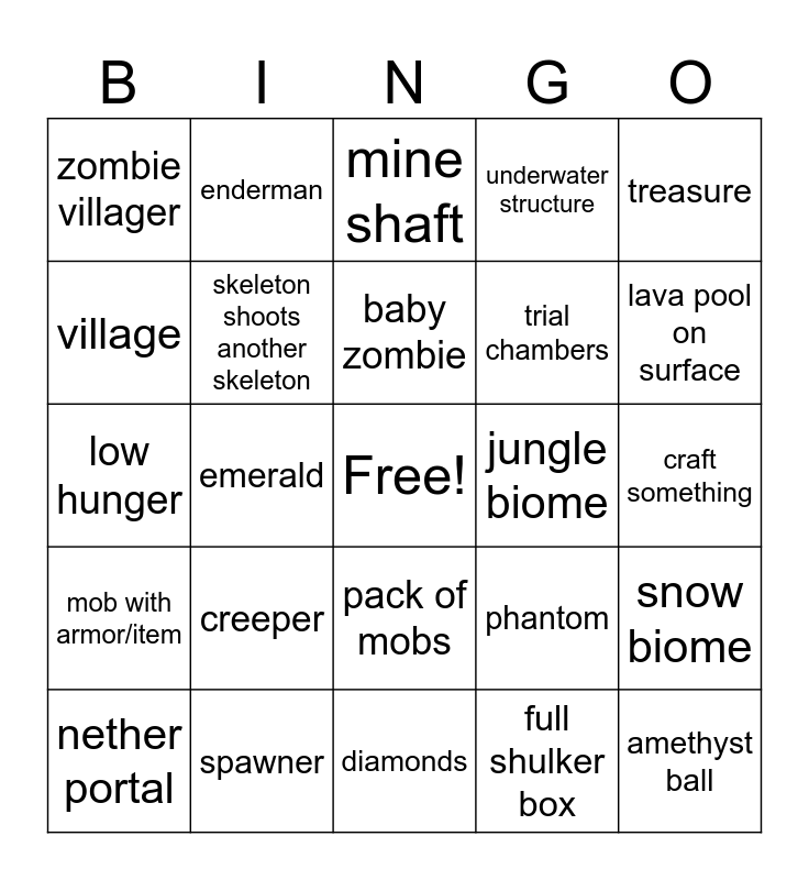 This bingo card has a free space and 24 words: creeper, spawner, baby zombie, nether portal, treasure, zombie villager, village, enderman, jungle biome, pack of mobs, trial chambers, low hunger, phantom, snow biome, skeleton shoots another skeleton, full shulker box, craft something, mine shaft, lava pool on surface, emerald, amethyst ball, mob with armor/item, underwater structure and diamonds.