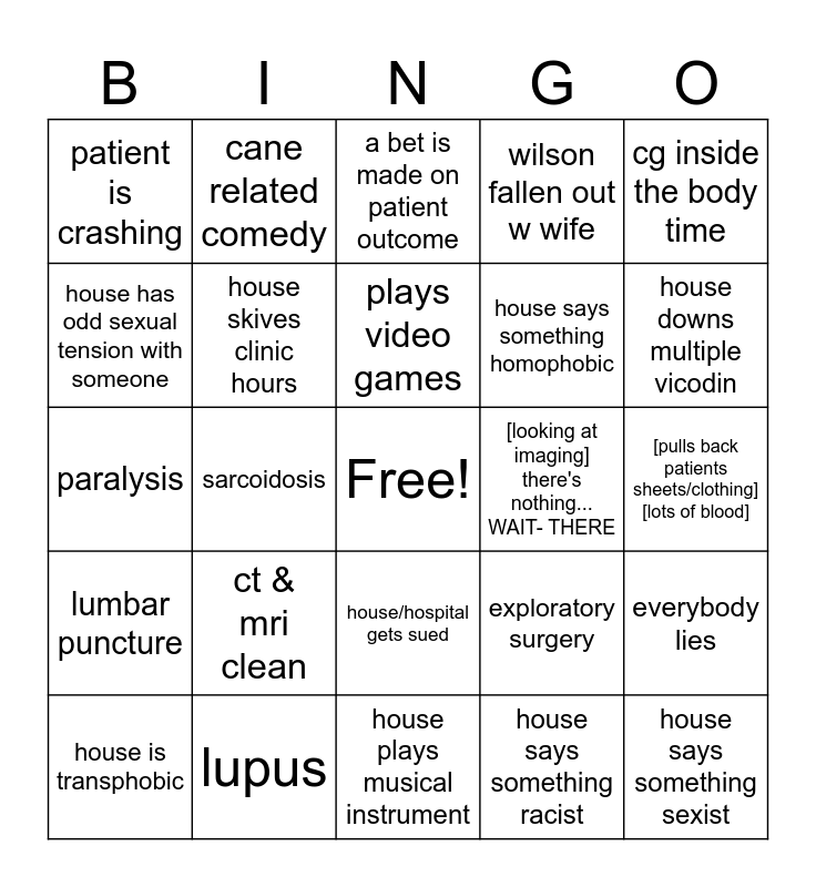 This bingo card has a free space and 30 words: lupus, vasculitis, sarcoidosis, breaks into someone's house, patient is crashing, a bet is made on patient outcome, house skives clinic hours, house/hospital gets sued, [looking at imaging] there's nothing... WAIT- THERE, house plays musical instrument, [pulls back patients sheets/clothing] [lots of blood], house says something sexist, house says something racist, house barges into cuddy's office, house downs multiple vicodin, drills into head, exploratory surgery, lumbar puncture, ct & mri clean, cg inside the body time, paralysis, someone calls/implies house is an addict, cane related comedy, house says something homophobic, house has odd sexual tension with someone, wilson fallen out w wife, everybody lies, house is transphobic, plays video games and house secretly does something nice.