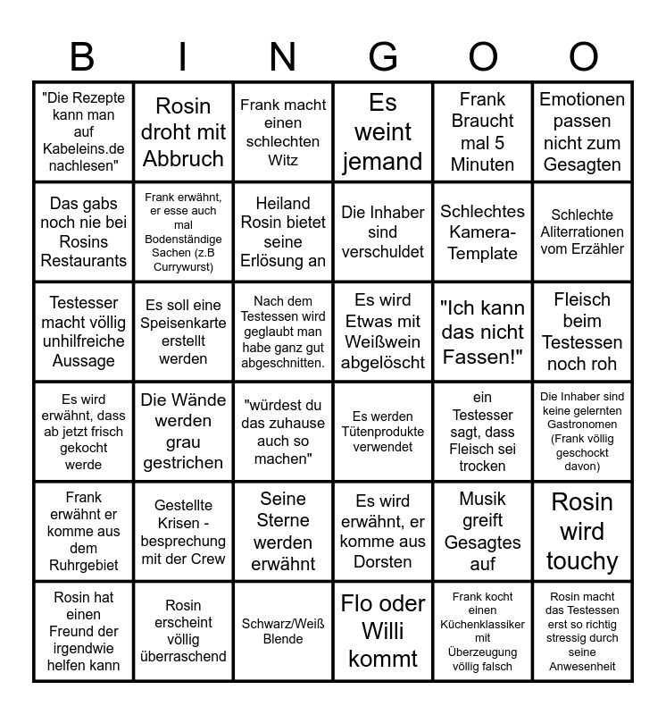 This bingo card has 36 words: Es wird erwähnt, er komme aus Dorsten, Seine Sterne werden erwähnt, Flo oder Willi kommt, Das gabs noch nie bei Rosins Restaurants, Es wird erwähnt, dass ab jetzt frisch gekocht werde, Es wird Etwas mit Weißwein abgelöscht, Frank erwähnt, er esse auch mal Bodenständige Sachen (z.B Currywurst), Schwarz/Weiß Blende, Frank Braucht mal 5 Minuten, Musik greift Gesagtes auf, Schlechte Aliterrationen vom Erzähler, Es weint jemand, Rosin wird touchy, Es soll eine Speisenkarte erstellt werden, Die Inhaber sind verschuldet, "Die Rezepte kann man auf Kabeleins.de nachlesen", Frank erwähnt er komme aus dem Ruhrgebiet, "Ich kann das nicht Fassen!", Testesser macht völlig unhilfreiche Aussage, Frank macht einen schlechten Witz, Nach dem Testessen wird geglaubt man habe ganz gut abgeschnitten., Die Wände werden grau gestrichen, Es werden Tütenprodukte verwendet, "würdest du das zuhause auch so machen", ein Testesser sagt, dass Fleisch sei trocken, Rosin droht mit Abbruch, Schlechtes Kamera-Template, Rosin erscheint völlig überraschend, Heiland Rosin bietet seine Erlösung an, Emotionen passen nicht zum Gesagten, Rosin macht das Testessen erst so richtig stressig durch seine Anwesenheit, Rosin hat einen Freund der irgendwie helfen kann, Die Inhaber sind keine gelernten Gastronomen (Frank völlig geschockt davon), Fleisch beim Testessen noch roh, Gestellte Krisen -besprechung mit der Crew and Frank kocht einen Küchenklassiker mit Überzeugung völlig falsch.