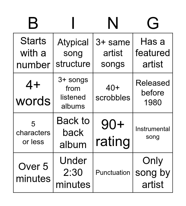 This bingo card has 16 words: Under 2:30 minutes, Instrumental song, 3+ same artist songs, Starts with a number, 5 characters or less, Atypical song structure, 90+ rating, Punctuation, 4+ words, 3+ songs from listened albums, Over 5 minutes, Has a featured artist, Back to back album, Released before 1980, 40+ scrobbles and Only song by artist.