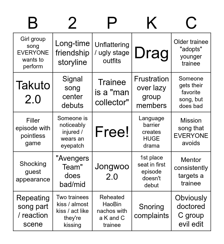 This bingo card has a free space and 24 words: Repeating song part / reaction scene, "Avengers Team" does bad/mid, Trainee is a "man collector", Snoring complaints, Older trainee "adopts" younger trainee, Girl group song EVERYONE wants to perform, Long-time friendship storyline, Unflattering / ugly stage outfits, Language barrier creates HUGE drama, Mission song that EVERYONE avoids, Filler episode with pointless game, Signal song center debuts, 1st place seat in first episode doesn't debut, Mentor consistently targets a trainee, Takuto 2.0, Two trainees kiss / almost kiss / act like they're kissing, Reheated HaoBin nachos with a K and C trainee, Drag, Someone gets their favorite song, but does bad, Shocking guest appearance, Someone is noticeably injured / wears an eyepatch, Jongwoo 2.0, Frustration over lazy group members and Obviously doctored C group evil edit.