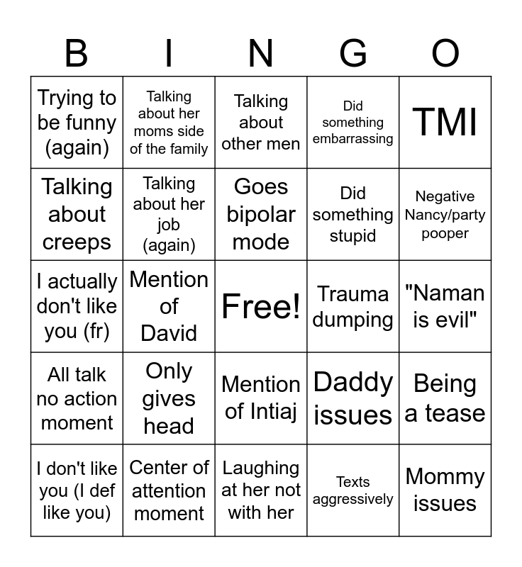 This bingo card has a free space and 24 words: I don't like you (I def like you), Only gives head, Goes bipolar mode, Texts aggressively, TMI, Trying to be funny (again), Talking about her moms side of the family, Talking about other men, Trauma dumping, "Naman is evil", I actually don't like you (fr), Talking about her job (again), Daddy issues, Being a tease, Talking about creeps, Center of attention moment, Laughing at her not with her, Did something embarrassing, Negative Nancy/party pooper, All talk no action moment, Mention of David, Mention of Intiaj, Did something stupid and Mommy issues.