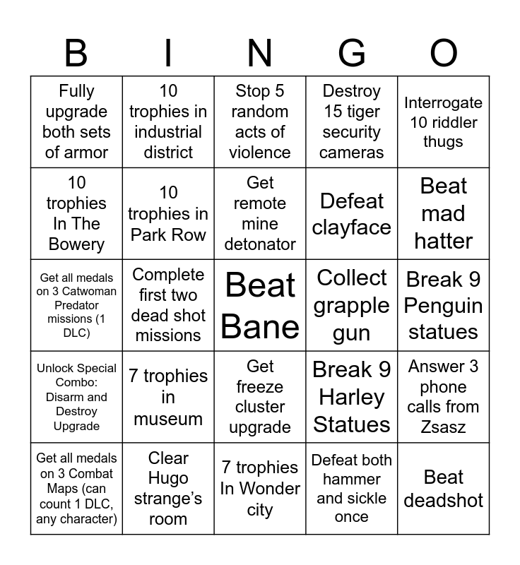 This bingo card has 50 words: Find hush, Beat Bane, Complete azreal side mission, 7 trophies In Wonder city, 7 trophies in museum, 10 Trophies in amusement mile, 10 trophies in industrial district, 7 trophies in subway, 10 trophies In The Bowery, 7 trophies in steel mill, 10 trophies in Park Row, Destroy 15 tiger security cameras, Answer 3 phone calls from Zsasz, Break 9 Harley Statues, 15 physical challenges, Complete all AR trainings, Get remote mine detonator, Collect grapple gun, Defeat poison ivy, Interrogate 10 riddler thugs, Complete first two dead shot missions, Defeat both hammer and sickle once, Fully upgrade both sets of armor, Defeat clayface, Defeat raj al-goul, Beat deadshot, Beat mad hatter, Beat zsasz, Stop 5 random acts of violence, Get freeze cluster upgrade, Rescue nora, Defeat Solomon grundy, Beat mr. freeze, Walk out of Arkham city (catwoman), Clear Hugo strange’s room, Scarecrow Easter egg, Solve 10 riddles, Rescue Vickie vale, Save three riddler hostages (courthouse, 2nd, 3rd), Break 9 Penguin statues, Break 9 Demon Seals in Wonder City, Break 9 chattering teeth, Pop 12 Balloons, Get all medals on 3 Predator Maps (can count 1 DLC), Get all medals on 3 Combat Maps (can count 1 DLC, any character), Get all medals on 3 Catwoman Predator missions (1 DLC), Get all medals on 3 Robin Predator missions (1 DLC), Get all medals on 3 Nightwing Predator missions (1 DLC), Unlock Special Combo: Disarm and Destroy Upgrade and Fully upgrade Catwoman.