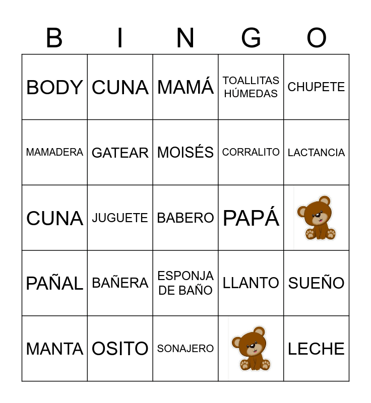 This bingo card has 2 images and 23 words: PAÑAL, OSITO, BABERO, CHUPETE, BODY, CUNA, MAMÁ, PAPÁ, SUEÑO, MAMADERA, GATEAR, SONAJERO, LLANTO, LACTANCIA, MANTA, JUGUETE, MOISÉS, CORRALITO, CUNA, BAÑERA, ESPONJA DE BAÑO, TOALLITAS HÚMEDAS and LECHE.