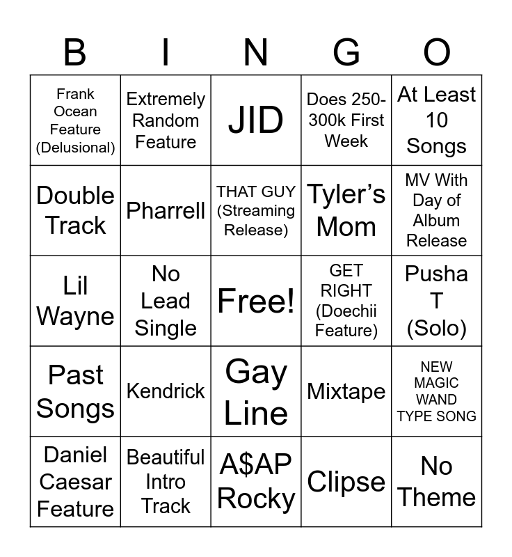 This bingo card has a free space and 24 words: Kendrick, Beautiful Intro Track, THAT GUY (Streaming Release), Daniel Caesar Feature, At Least 10 Songs, Frank Ocean Feature (Delusional), Double Track, Extremely Random Feature, GET RIGHT (Doechii Feature), Gay Line, Tyler’s Mom, Lil Wayne, Mixtape, NEW MAGIC WAND TYPE SONG, Pharrell, Clipse, Pusha T (Solo), JID, MV With Day of Album Release, No Lead Single, No Theme, Past Songs, Does 250-300k First Week and A$AP Rocky.