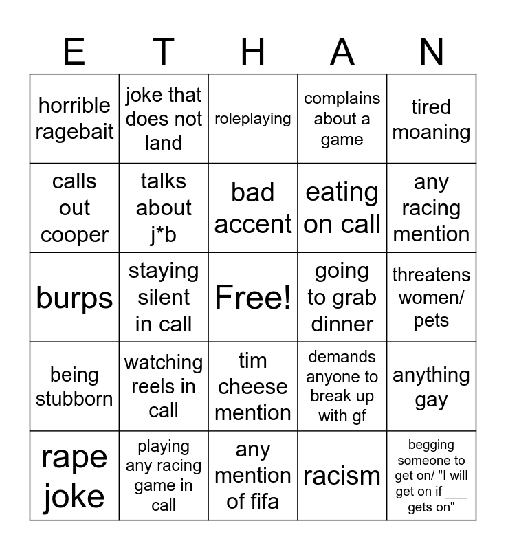 This bingo card has a free space and 24 words: watching reels in call, playing any racing game in call, bad accent, rape joke, tired moaning, horrible ragebait, calls out cooper, joke that does not land, going to grab dinner, tim cheese mention, eating on call, burps, demands anyone to break up with gf, anything gay, talks about j*b, racism, threatens women/ pets, roleplaying, any racing mention, staying silent in call, begging someone to get on/ "I will get on if ___ gets on", being stubborn, complains about a game and any mention of fifa.