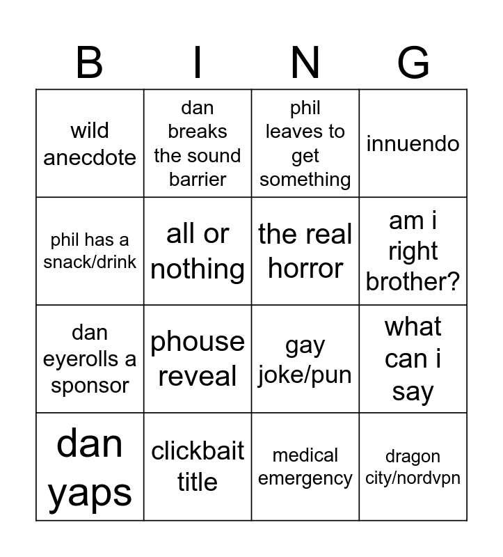 This bingo card has 17 words: medical emergency, dan yaps, phil leaves to get something, wild anecdote, phouse reveal, innuendo, what can i say, the real horror, am i right brother?, all or nothing, clickbait title, gay joke/pun, phil has a snack/drink, dan breaks the sound barrier, dan eyerolls a sponsor, phil says something incredibly out of pocket and dragon city/nordvpn.