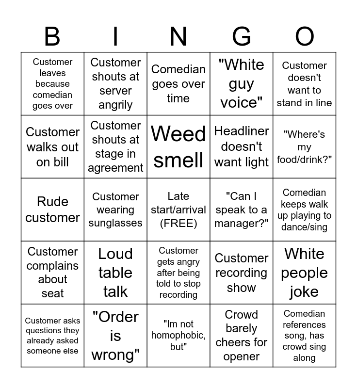 This bingo card has a free space and 25 words: Loud table talk, "Im not homophobic, but", Weed smell, Customer asks questions they already asked someone else, Customer doesn't want to stand in line, Customer leaves because comedian goes over, Customer walks out on bill, Customer shouts at server angrily, "Can I speak to a manager?", Customer gets angry after being told to stop recording, Headliner doesn't want light, Rude customer, Customer recording show, White people joke, Customer shouts at stage in agreement, No tip/bad tip, Comedian keeps walk up playing to dance/sing, Comedian goes over time, "Where's my food/drink?", Customer wearing sunglasses, Comedian references song, has crowd sing along, "Order is wrong", Customer complains about seat, "White guy voice" and Crowd barely cheers for opener.