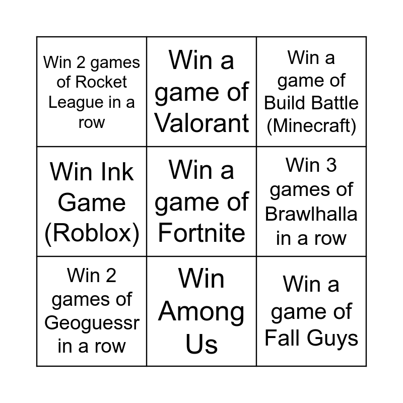 This bingo card has a free space and 8 words: Win 3 games of Brawlhalla in a row, Win a game of Build Battle (Minecraft), Win a game of Valorant, Win 2 games of Geoguessr in a row, Win 2 games of Rocket League in a row, Win a game of Fall Guys, Win Ink Game (Roblox) and Win Among Us.