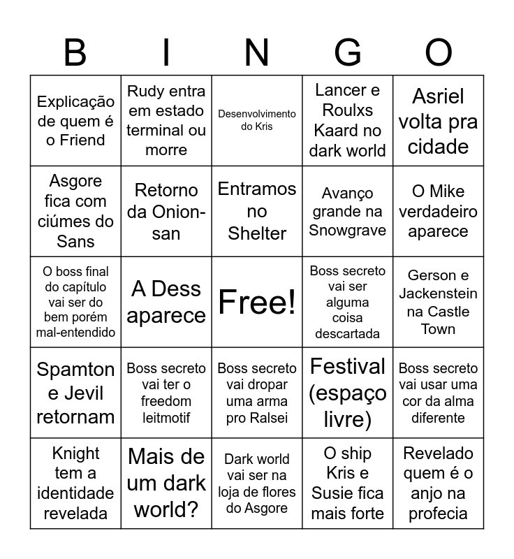 This bingo card has a free space and 25 words: Boss secreto vai ter o freedom leitmotif, Dark world vai ser na loja de flores do Asgore, Entramos no Shelter, Knight tem a identidade revelada, Asriel volta pra cidade, Explicação de quem é o Friend, Asgore fica com ciúmes do Sans, Rudy entra em estado terminal ou morre, Boss secreto vai ser alguma coisa descartada, Boss secreto vai dropar uma arma pro Ralsei, Avanço grande na Snowgrave, O boss final do capítulo vai ser do bem porém mal-entendido, Festival (espaço livre), Boss secreto vai usar uma cor da alma diferente, Retorno da Onion-san, O Jockington vai ser importante, Gerson e Jackenstein na Castle Town, Desenvolvimento do Kris, O Mike verdadeiro aparece, A Dess aparece, Revelado quem é o anjo na profecia, Mais de um dark world?, Spamton e Jevil retornam, Lancer e Roulxs Kaard no dark world and O ship Kris e Susie fica mais forte.