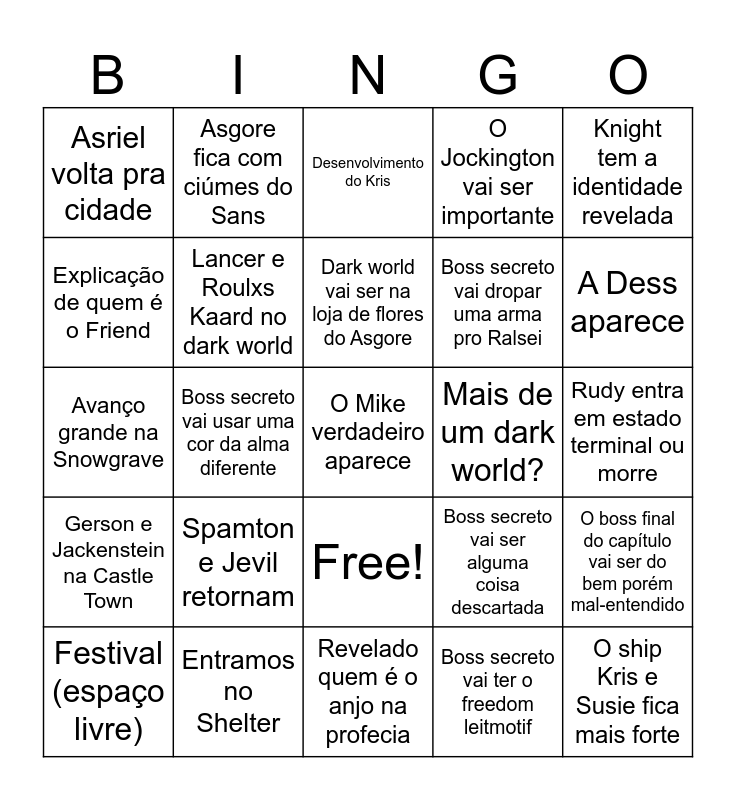 This bingo card has 26 words: Free!, Boss secreto vai ter o freedom leitmotif, Dark world vai ser na loja de flores do Asgore, Entramos no Shelter, Knight tem a identidade revelada, Asriel volta pra cidade, Explicação de quem é o Friend, Asgore fica com ciúmes do Sans, Rudy entra em estado terminal ou morre, Boss secreto vai ser alguma coisa descartada, Boss secreto vai dropar uma arma pro Ralsei, Avanço grande na Snowgrave, O boss final do capítulo vai ser do bem porém mal-entendido, Festival (espaço livre), Boss secreto vai usar uma cor da alma diferente, Retorno da Onion-san, O Jockington vai ser importante, Gerson e Jackenstein na Castle Town, Desenvolvimento do Kris, O Mike verdadeiro aparece, A Dess aparece, Revelado quem é o anjo na profecia, Mais de um dark world?, Spamton e Jevil retornam, Lancer e Roulxs Kaard no dark world and O ship Kris e Susie fica mais forte.