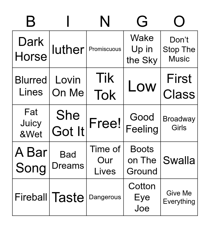 This bingo card has a free space and 59 words: Needed Me, Taste, Leave The Door Open, A Bar Song, Cotton Eye Joe, Leave Before You Love Me, Lovin On Me, Treasure, Low, Bang Bang, Wake Up in the Sky, Marvin Gaye, Blurred Lines, Love You Like A Love Song, Yeah!, Dark Horse, Give Me Everything, Don’t Stop The Music, Want to Want Me, Tik Tok, Good Feeling, Promiscuous, Fireball, Swalla, I Know You Want Me, 24k Magic, Uptown Funk, SOS, First Class, Sure Thing, Keep On Rollin, Let Me Blow Ya Mind, Take It to da House, Family Affair, luther, Best Friend, Bartender, She Got It, Whiskey Whiskey, Fat Juicy &Wet, Magic Stick, Bad Dreams, Broadway Girls, Somethin’ Bout A Woman, Left and Right, It Was A Good Day, 1,2 Step, Booty Wurk, Time of Our Lives, Dangerous, I Wanna Love You, Candy Shop, Say It Right, Love The Way You Lie, Young, Wild &Free, Boots on The Ground, Stay ‘N Yo Lane, Hotel Room Service and Boom Boom Pow.