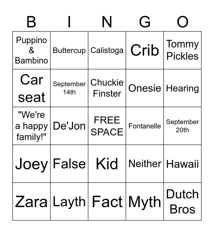 This bingo card has a free space and 29 words: Zara, Tabitha, De'Jon, Yellow Toe, Puppino & Bambino, Calistoga, September 14th, False, Fontanelle, Layth, September 20th, Dutch Bros, Fact, Myth, Hearing, X Æ A-12, Kid, Joey, Tommy Pickles, "We're a happy family!", Neither, True, Onesie, Car seat, Crib, Buttercup, Hawaii, Chuckie Finster and September 18th.