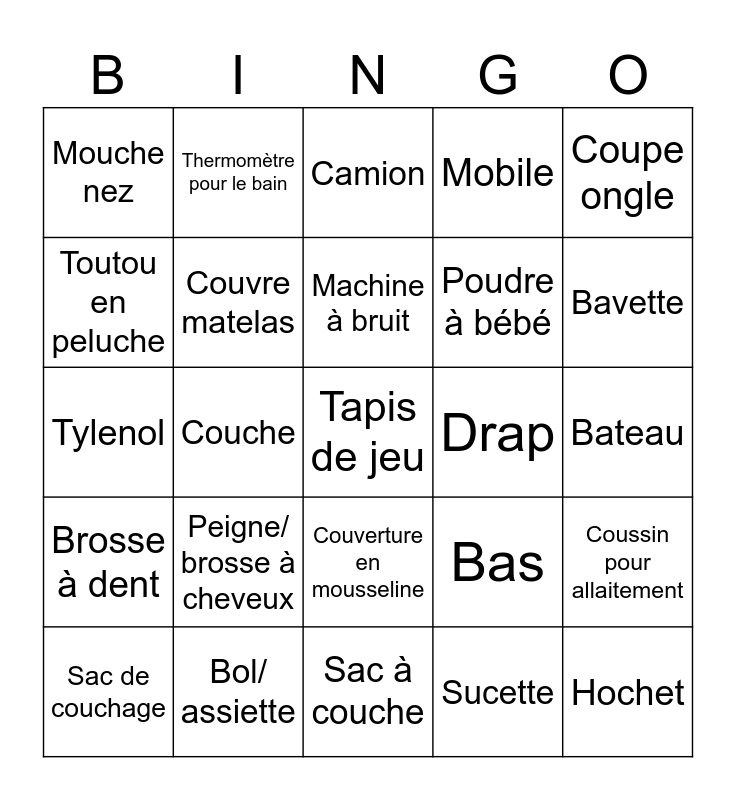 This bingo card has 35 words: Pair de jeans, Moniteur, Tire lait, Couvre matelas, Couverture en mousseline, Mobile, Toutou en peluche, Porte bébé, Machine à bruit, Serviette de bain à capuchon, Tylenol, Coupe ongle, Poubelle à couche, Bain, Mouche nez, Drap, Sucette, Couche, Brosse à dent, Tapis de jeu, Bas, Sac de couchage, Coussin pour allaitement, Bol/ assiette, Camion, Bavette, Hochet, Parc, Poudre à bébé, Bateau, Lingette, Sac à couche, Peigne/ brosse à cheveux, Thermomètre pour le bain and Biberon.