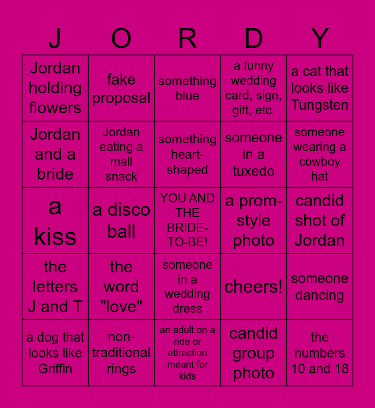 This bingo card has a free space and 24 words: the word "love", non-traditional rings, something heart-shaped, a dog that looks like Griffin, a cat that looks like Tungsten, Jordan holding flowers, Jordan and a bride, fake proposal, a prom-style photo, someone in a wedding dress, someone in a tuxedo, a kiss, cheers!, someone dancing, Jordan eating a mall snack, candid group photo, candid shot of Jordan, something blue, someone wearing a cowboy hat, a disco ball, the numbers 10 and 18, the letters J and T, a funny wedding card, sign, gift, etc. and an adult on a ride or attraction meant for kids.