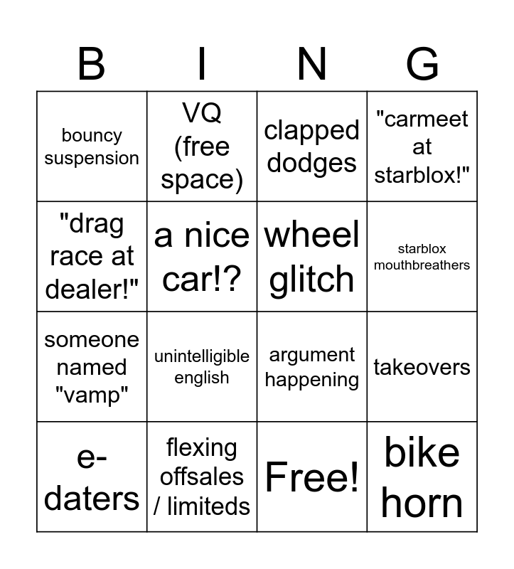 This bingo card has 17 words: Free!, e-daters, clapped dodges, bouncy suspension, unintelligible english, "carmeet at starblox!", takeovers, wheel glitch, starblox mouthbreathers, a nice car!?, flexing offsales / limiteds, argument happening, "drag race at dealer!", VQ (free space), someone named "vamp", squatted truck and bike horn.