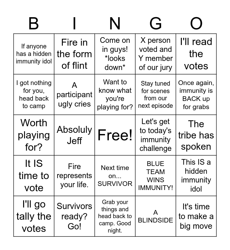 This bingo card has a free space and 24 words: Fire represents your life., Survivors ready? Go!, Want to know what you're playing for?, I'll go tally the votes, I'll read the votes, If anyone has a hidden immunity idol, I got nothing for you, head back to camp, Fire in the form of flint, Let's get to today's immunity challenge, Next time on... SURVIVOR, Stay tuned for scenes from our next episode, Worth playing for?, BLUE TEAM WINS IMMUNITY!, This IS a hidden immunity idol, A participant ugly cries, A BLINDSIDE, The tribe has spoken, Come on in guys! *looks down*, Once again, immunity is BACK up for grabs, Absoluly Jeff, It's time to make a big move, It IS time to vote, X person voted and Y member of our jury and Grab your things and head back to camp. Good night..