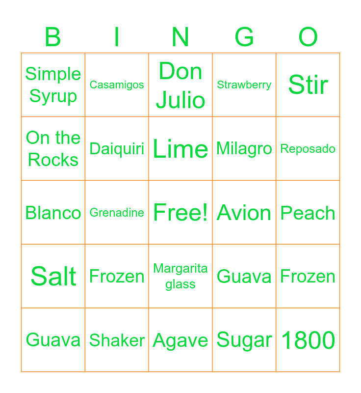 ⚠ This card has duplicate items: Margarita (2), Pineapple (2), Don Julio (2), Patron (2), Casamigos (2), 1800 (2), Margarita glass (2), Blueberry (2), Mango (2), Salt (2), Anejo (2), Sugar (2), Strawberry (2), Simple Syrup (2), Raspberry (2), On the Rocks (2), Ice (2), Frozen (2), Shaker (2), Peach (2), Shots (2), Stir (2), Blanco (2), Lime (2), Daiquiri (2), Chaser (2), Cocktails (2), Jose Cuervo (2), Grenadine (2), Milagro (2), Reposado (2), Mint (2), Agave (2), Triple Sec (2), Guava (2), Avion (2), Pina colada (2), Liqueur (2), Tajin (2)