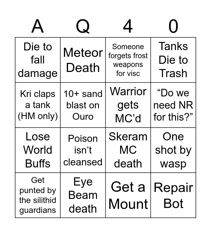 This bingo card has 17 words: Get a Mount, Get punted by the silithid guardians, Someone forgets frost weapons for visc, Die to fall damage, Poison isn’t cleansed, Tanks Die to Trash, One shot by wasp, Warrior gets MC’d, “Do we need NR for this?”, 10+ sand blast on Ouro, Eye Beam death, Skeram MC death, Kri claps a tank (HM only), Meteor Death, Lose World Buffs, Too many Bugs on Emps and Repair Bot.