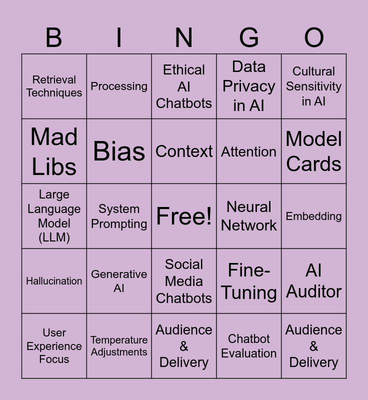 This bingo card has a free space and 24 words: Generative AI, Temperature Adjustments, Context, User Experience Focus, Cultural Sensitivity in AI, Retrieval Techniques, Mad Libs, Processing, Neural Network, Social Media Chatbots, Attention, Large Language Model (LLM), Fine-Tuning, AI Auditor, Bias, Chatbot Evaluation, Embedding, Ethical AI Chatbots, Model Cards, System Prompting, Audience & Delivery, Hallucination, Data Privacy in AI and Audience & Delivery.