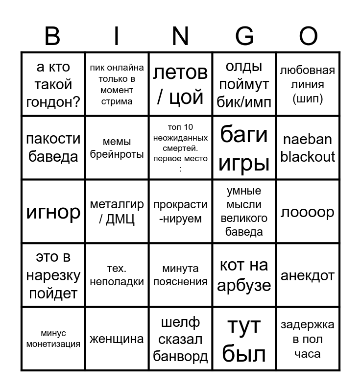 This bingo card has 25 words: тех. неполадки, шелф сказал банворд, топ 10 неожиданных смертей. первое место :, минус монетизация, любовная линия (шип), а кто такой гондон?, пакости баведа, пик онлайна только в момент стрима, умные мысли великого баведа, минута пояснения, баги игры, игнор, кот на арбузе, анекдот, мемы брейнроты, задержка в пол часа, лоооор, летов / цой, naeban blackout, металгир / ДМЦ, прокрасти -нируем, женщина, это в нарезку пойдет, олды поймут бик/имп and тут был.