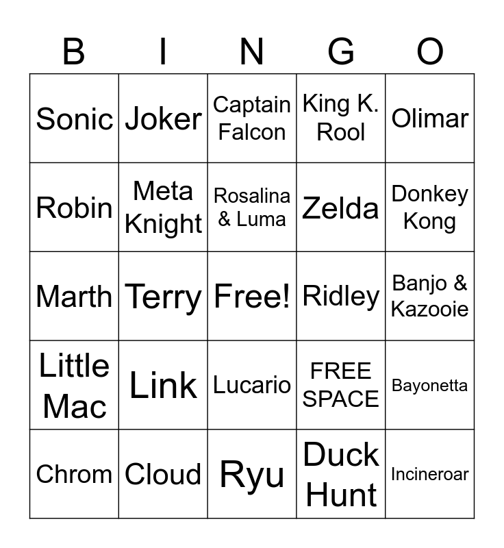 This bingo card has a free space and 25 words: Link, Ryu, Rosalina & Luma, Chrom, Olimar, Sonic, Robin, Joker, Ridley, Lucario, Zelda, Marth, FREE SPACE, Bayonetta, Meta Knight, Daisy, Banjo & Kazooie, Captain Falcon, Donkey Kong, Terry, Incineroar, Cloud, Little Mac, King K. Rool and Duck Hunt.