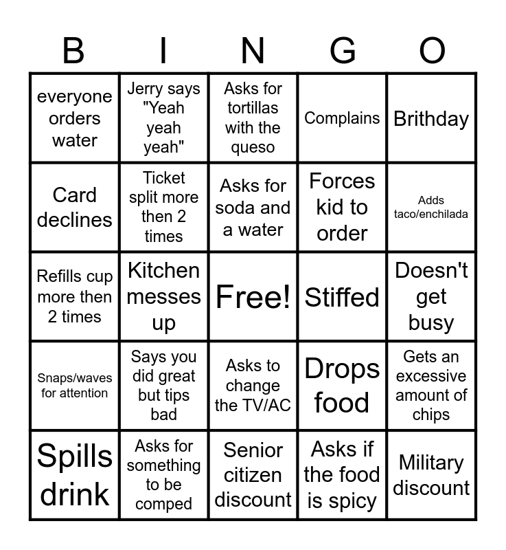 This bingo card has a free space and 39 words: Asks for a manager, Adult wants to eat off the kids menu, Uses a gift cert, Ticket split more then 2 times, Spills drink, Asks to change the TV/AC, Asks for soda and a water, More then 20% tip, Brithday, Snaps/waves for attention, Kitchen messes up, Complains, Military discount, Doesn't get busy, Stiffed, Says you did great but tips bad, Coke/diet coke with a lime, everyone orders water, Orders a la carte, Drops food, Card declines, Senior citizen discount, Forces kid to order, Adds taco/enchilada, Sergio says something stupid, Fernando asks for runner with nothing to run, Fernando crashes out, Double sits you, Says they told you something they didn't, Jerry says "Yeah yeah yeah", The guys say something gay, Gets paid to roll for someone, Asks for tortillas with the queso, Asks for something to be comped, Asks if the food is spicy, Asks for opinion and ignores you, Gets an excessive amount of chips, Refills cup more then 2 times and Doesn't leave after paying "campers".