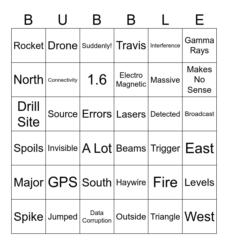 This bingo card has 66 words: Laser, Fire, Field, Invisible, GPS, Command Center, Drone, Copy That, Connectivity, GHz, Broadcast, High Strangeness, Errors, Interference, Homestead 2, Gamma Rays, Makes No Sense, Rocket, Barrier, 1.6, Detected, Lasers, Travis, Spike, Mesa, Triangle, Data Corruption, Metallic, Drill Site, Cloned, A Lot, 1.2, Borehole, Rocket Launch, Spoils, Beams, Command Center, Massive, East, West, North, South, Source, Inside, Crazy, Jumped, Electro Magnetic, Spiked, Major, Haywire, Witness, Detectors, Drill Site, Experiment, Wow, Levels, Boundary, Good Chute, Suddenly!, Trigger, Outside, Launch, Energy, What is going on?, What is that? and Launch.