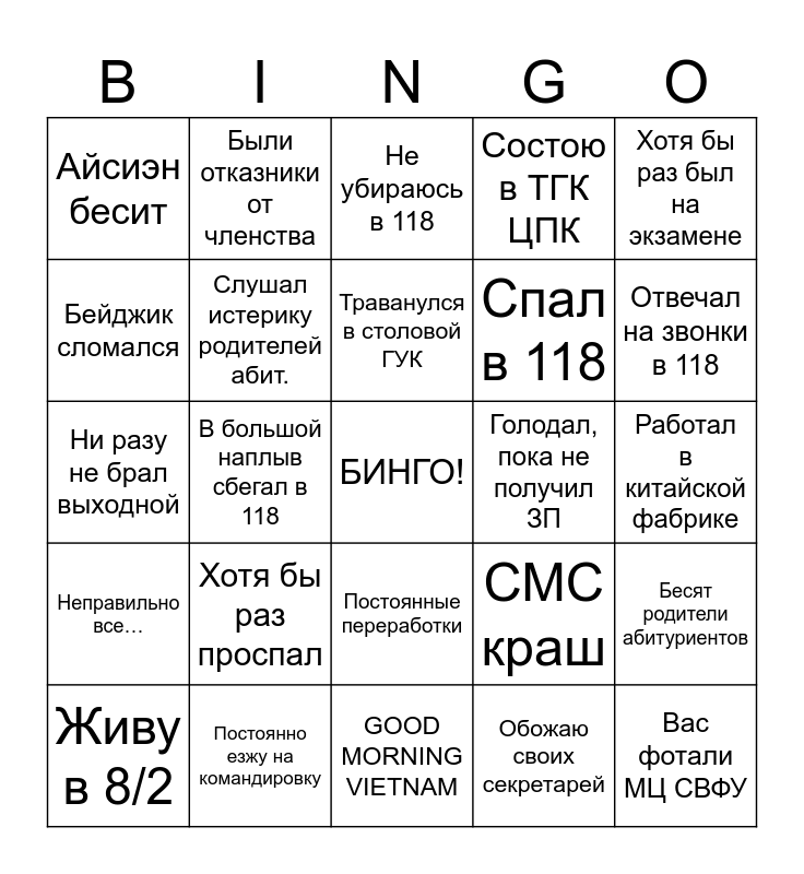 This bingo card has a free space and 24 words: Хотя бы раз проспал, Постоянно езжу на командировку, Траванулся в столовой ГУК, Живу в 8/2, Хотя бы раз был на экзамене, Айсиэн бесит, Бейджик сломался, Были отказники от членства, Голодал, пока не получил ЗП, Постоянные переработки, Спал в 118, Ни разу не брал выходной, СМС краш, Бесят родители абитуриентов, Слушал истерику родителей абит., Обожаю своих секретарей, Работал в китайской фабрике, Не убираюсь в 118, Отвечал на звонки в 118, В большой наплыв сбегал в 118, Вас фотали МЦ СВФУ, Неправильно все…, Состою в ТГК ЦПК and GOOD MORNING VIETNAM.