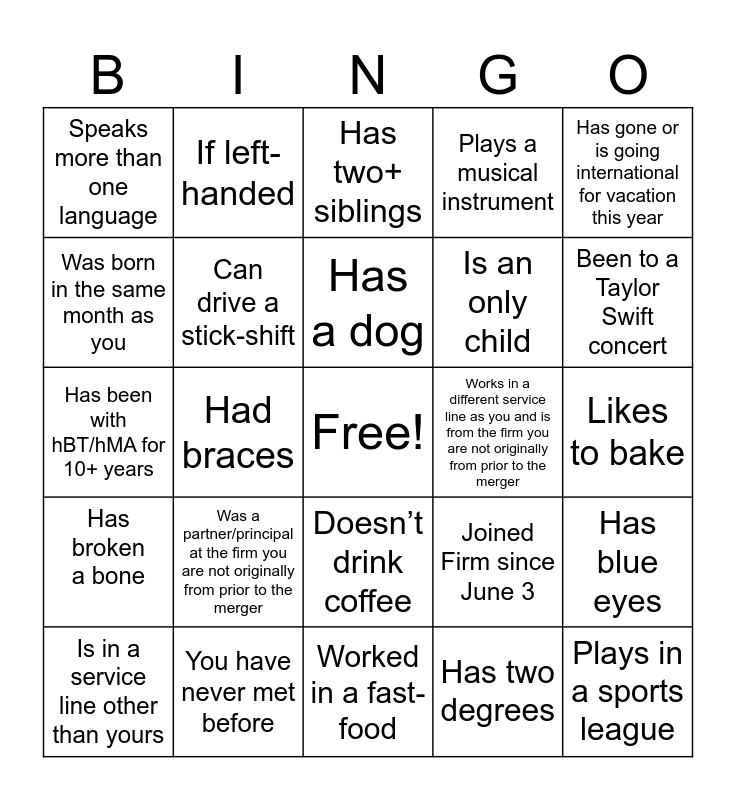 This bingo card has a free space and 24 words: Was a partner/principal at the firm you are not originally from prior to the merger, You have never met before, Has a dog, Is in a service line other than yours, Has gone or is going international for vacation this year, Speaks more than one language, Was born in the same month as you, If left-handed, Works in a different service line as you and is from the firm you are not originally from prior to the merger, Doesn’t drink coffee, Is an only child, Has been with hBT/hMA for 10+ years, Joined Firm since June 3, Has blue eyes, Can drive a stick-shift, Has two degrees, Likes to bake, Has two+ siblings, Been to a Taylor Swift concert, Had braces, Plays in a sports league, Has broken a bone, Plays a musical instrument and Worked in a fast-food.