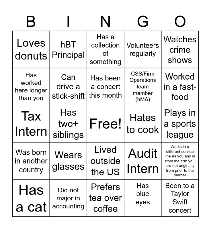 This bingo card has a free space and 24 words: Wears glasses, Did not major in accounting, Has been a concert this month, Has a cat, Watches crime shows, Loves donuts, Has worked here longer than you, hBT Principal, Hates to cook, Lived outside the US, CSS/Firm Operations team member (hMA), Tax Intern, Audit Intern, Works in a different service line as you and is from the firm you are not originally from prior to the merger, Can drive a stick-shift, Has blue eyes, Plays in a sports league, Has a collection of something, Worked in a fast-food, Has two+ siblings, Been to a Taylor Swift concert, Was born in another country, Volunteers regularly and Prefers tea over coffee.