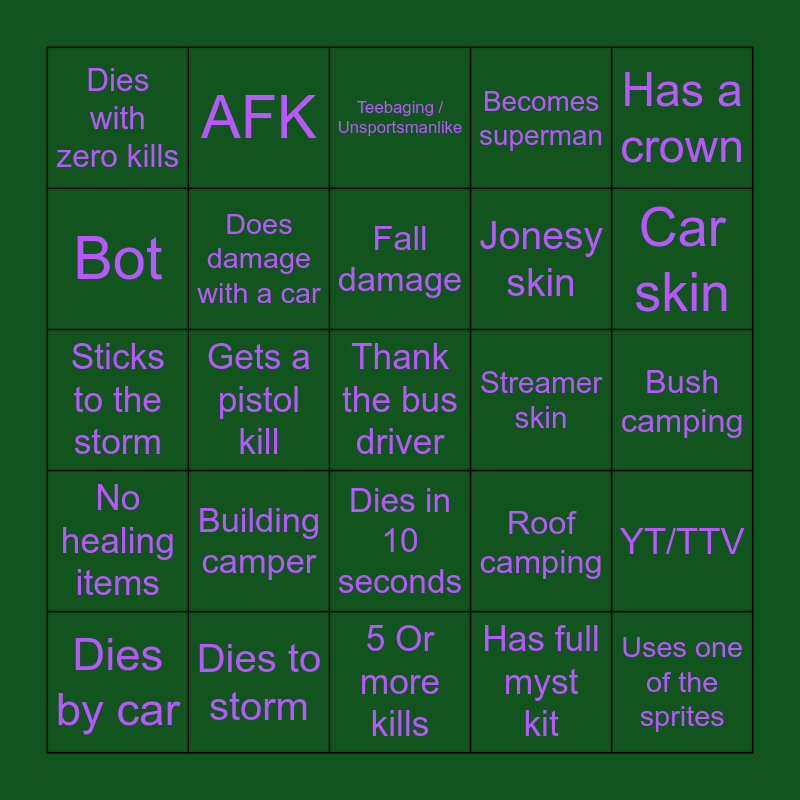 This bingo card has a free space and 24 words: Building camper, Dies to storm, Fall damage, Dies by car, Has a crown, Dies with zero kills, Bot, AFK, Streamer skin, Dies in 10 seconds, Jonesy skin, Sticks to the storm, Roof camping, YT/TTV, Does damage with a car, Has full myst kit, Bush camping, Teebaging / Unsportsmanlike, Car skin, Gets a pistol kill, Uses one of the sprites, No healing items, Becomes superman and 5 Or more kills.