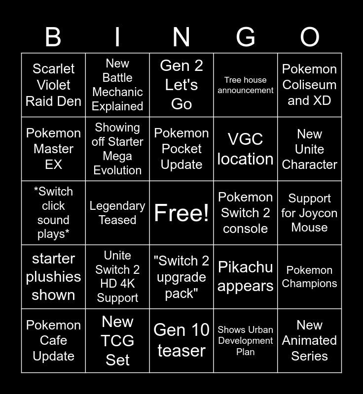 This bingo card has a free space and 24 words: Unite Switch 2 HD 4K Support, New TCG Set, Pokemon Pocket Update, Pokemon Cafe Update, Pokemon Coliseum and XD, Scarlet Violet Raid Den, Pokemon Master EX, New Battle Mechanic Explained, Pokemon Switch 2 console, "Switch 2 upgrade pack", VGC location, *Switch click sound plays*, Pikachu appears, Pokemon Champions, Showing off Starter Mega Evolution, Shows Urban Development Plan, Support for Joycon Mouse, Gen 2 Let's Go, New Unite Character, Legendary Teased, New Animated Series, starter plushies shown, Tree house announcement and Gen 10 teaser.