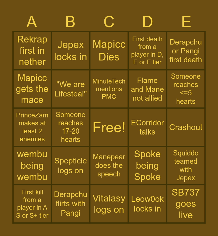 This bingo card has a free space and 24 words: Spepticle logs on, Derapchu flirts with Pangi, MinuteTech mentions PMC, First kill from a player in A S or S+ tier, Derapchu or Pangi first death, Rekrap first in nether, Mapicc gets the mace, Jepex locks in, ECorridor talks, Manepear does the speech, Flame and Mane not allied, PrinceZam makes at least 2 enemies, Spoke being Spoke, Squiddo teamed with Jepex, ''We are Lifesteal'', Leow0ok locks in, Crashout, Mapicc Dies, Someone reaches <=5 hearts, Someone reaches 17-20 hearts, SB737 goes live, wembu being wembu, First death from a player in D, E or F tier and Vitalasy logs on.