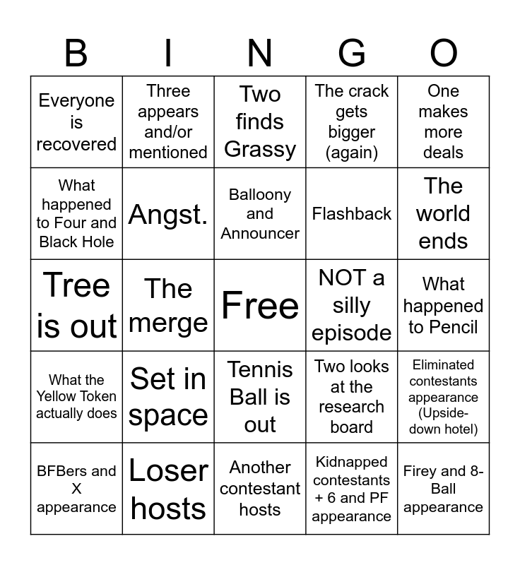 This bingo card has a free space and 24 words: Set in space, Loser hosts, Balloony and Announcer, BFBers and X appearance, One makes more deals, Everyone is recovered, What happened to Four and Black Hole, Three appears and/or mentioned, NOT a silly episode, Tennis Ball is out, Flashback, Tree is out, Two looks at the research board, Eliminated contestants appearance (Upside-down hotel), Angst., Kidnapped contestants + 6 and PF appearance, What happened to Pencil, Two finds Grassy, The world ends, The merge, Firey and 8-Ball appearance, What the Yellow Token actually does, The crack gets bigger (again) and Another contestant hosts.