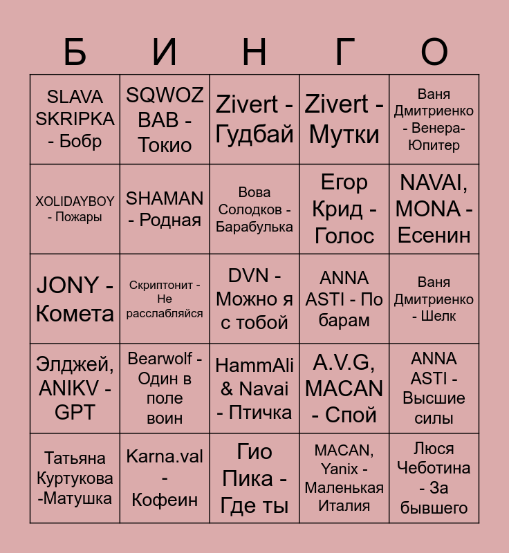 This bingo card has a free space and 24 words: Bearwolf - Один в поле воин, Karna.val - Кофеин, Вова Солодков - Барабулька, Татьяна Куртукова -Матушка, Ваня Дмитриенко - Венера-Юпитер, SLAVA SKRIPKA - Бобр, XOLIDAYBOY - Пожары, SQWOZ BAB - Токио, ANNA ASTI - По барам, HammAli & Navai - Птичка, Егор Крид - Голос, JONY - Комета, A.V.G, MACAN - Спой, ANNA ASTI - Высшие силы, SHAMAN - Родная, MACAN, Yanix - Маленькая Италия, Ваня Дмитриенко - Шелк, Zivert - Гудбай, NAVAI, MONA - Есенин, Скриптонит - Не расслабляйся, Люся Чеботина - За бывшего, Элджей, ANIKV - GPT, Zivert - Мутки and Гио Пика - Где ты.