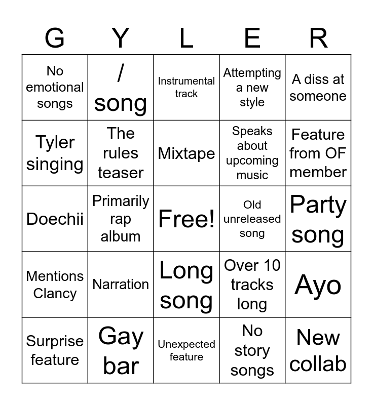 This bingo card has a free space and 24 words: Narration, Gay bar, Mixtape, Surprise feature, A diss at someone, No emotional songs, Tyler singing, / song, Old unreleased song, Long song, Speaks about upcoming music, Doechii, Over 10 tracks long, Ayo, The rules teaser, No story songs, Party song, Instrumental track, Feature from OF member, Primarily rap album, New collab, Mentions Clancy, Attempting a new style and Unexpected feature.