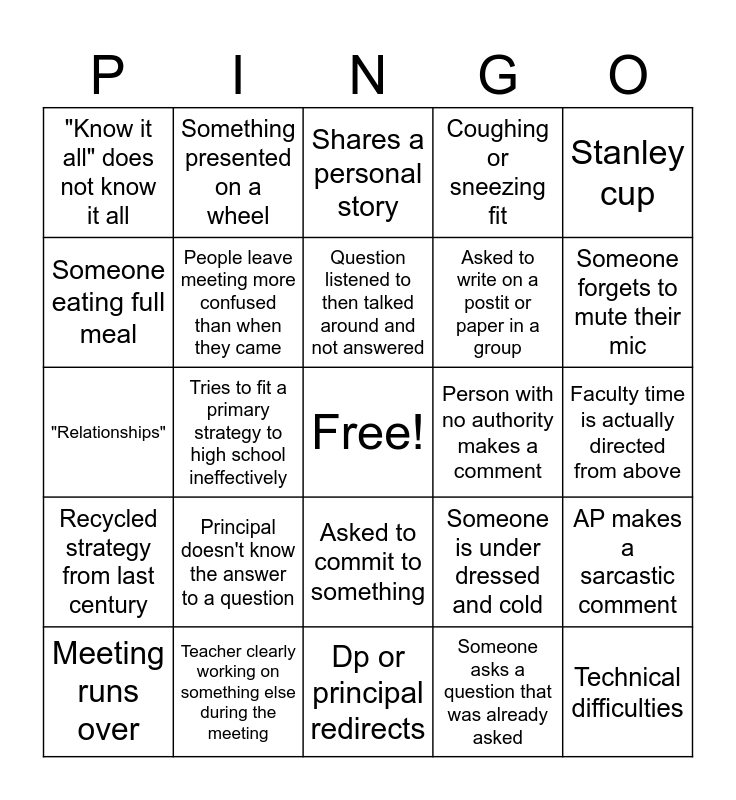 This bingo card has a free space and 28 words: AP makes a sarcastic comment, A comment is made to everyone but it is clearly addressed to one person, Asked to write on a postit or paper in a group, Someone asks a question that was already asked, Someone eating full meal, Shares a personal story, Something presented on a wheel, Recycled strategy from last century, Person with no authority makes a comment, Meeting runs over, "Relationships", Coughing or sneezing fit, Teacher clearly working on something else during the meeting, Dp or principal redirects, Someone forgets to mute their mic, Irrelevant college acheivements discussed, Principal doesn't know the answer to a question, People leave meeting more confused than when they came, Question listened to then talked around and not answered, Asked to commit to something, "Know it all" does not know it all, Same staff member asks more that 3 questions, Technical difficulties, Tries to fit a primary strategy to high school ineffectively, Faculty time is actually directed from above, Someone is under dressed and cold, Stanley cup and Someone falls asleep.