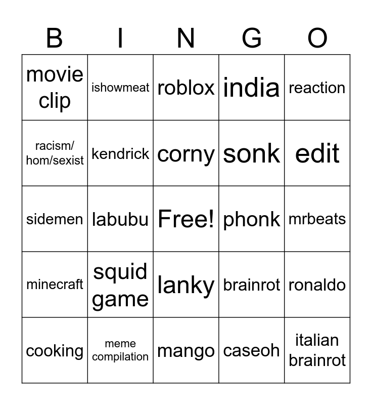This bingo card has a free space and 24 words: squid game, meme compilation, corny, cooking, reaction, movie clip, racism/ hom/sexist, ishowmeat, phonk, lanky, sonk, sidemen, brainrot, ronaldo, kendrick, caseoh, mrbeats, roblox, edit, labubu, italian brainrot, minecraft, india and mango.