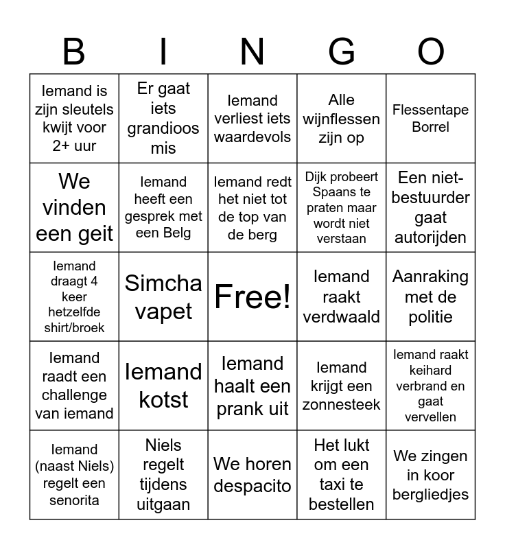This bingo card has a free space and 24 words: Iemand kotst, Niels regelt tijdens uitgaan, Iemand redt het niet tot de top van de berg, Iemand (naast Niels) regelt een senorita, Flessentape Borrel, Iemand is zijn sleutels kwijt voor 2+ uur, We vinden een geit, Er gaat iets grandioos mis, Iemand raakt verdwaald, Iemand haalt een prank uit, Dijk probeert Spaans te praten maar wordt niet verstaan, Iemand draagt 4 keer hetzelfde shirt/broek, Iemand krijgt een zonnesteek, Iemand raakt keihard verbrand en gaat vervellen, Iemand heeft een gesprek met een Belg, Het lukt om een taxi te bestellen, Aanraking met de politie, Iemand verliest iets waardevols, Een niet-bestuurder gaat autorijden, Simcha vapet, We zingen in koor bergliedjes, Iemand raadt een challenge van iemand, Alle wijnflessen zijn op and We horen despacito.