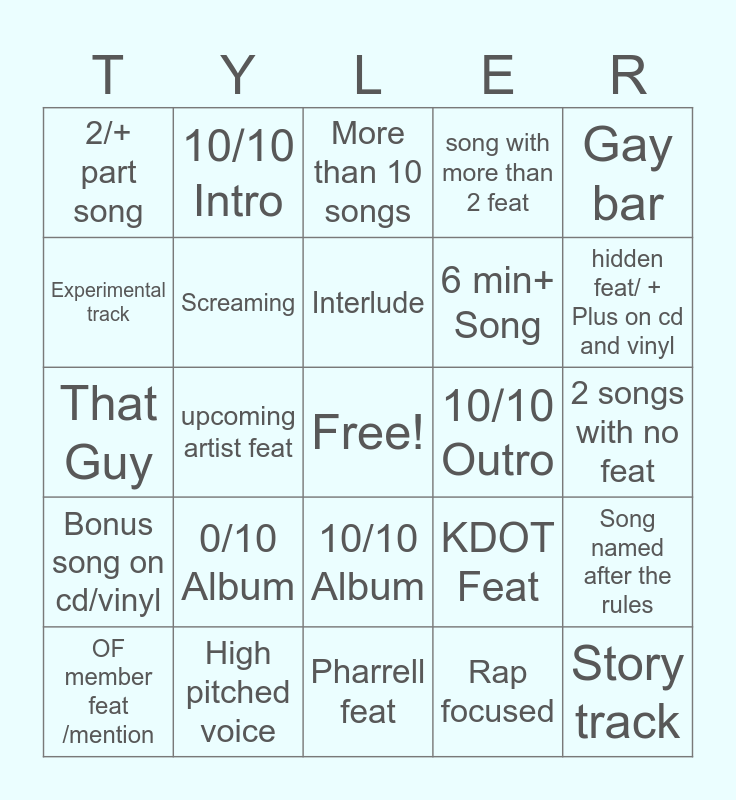 This bingo card has a free space and 24 words: 0/10 Album, High pitched voice, Interlude, OF member feat /mention, Gay bar, 2/+ part song, Experimental track, 10/10 Intro, 10/10 Outro, 10/10 Album, 6 min+ Song, That Guy, KDOT Feat, Song named after the rules, Screaming, Rap focused, 2 songs with no feat, More than 10 songs, hidden feat/ + Plus on cd and vinyl, upcoming artist feat, Story track, Bonus song on cd/vinyl, song with more than 2 feat and Pharrell feat.